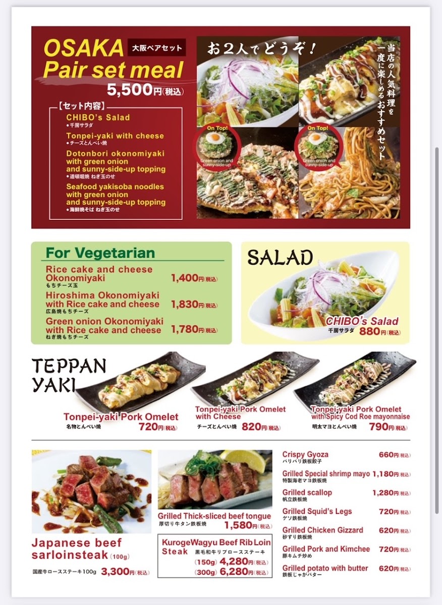 Welcome to Chibo Sonezakishiten, a culinary gem nestled in the heart of Osaka, Japan. This vibrant restaurant specializes in okonomiyaki, a savory Japanese pancake that is a must-try for any food enthusiast. Upon entering, guests are enveloped in a lively atmosphere, with the sizzle of ingredients filling the air as talented chefs prepare each dish in front of you.